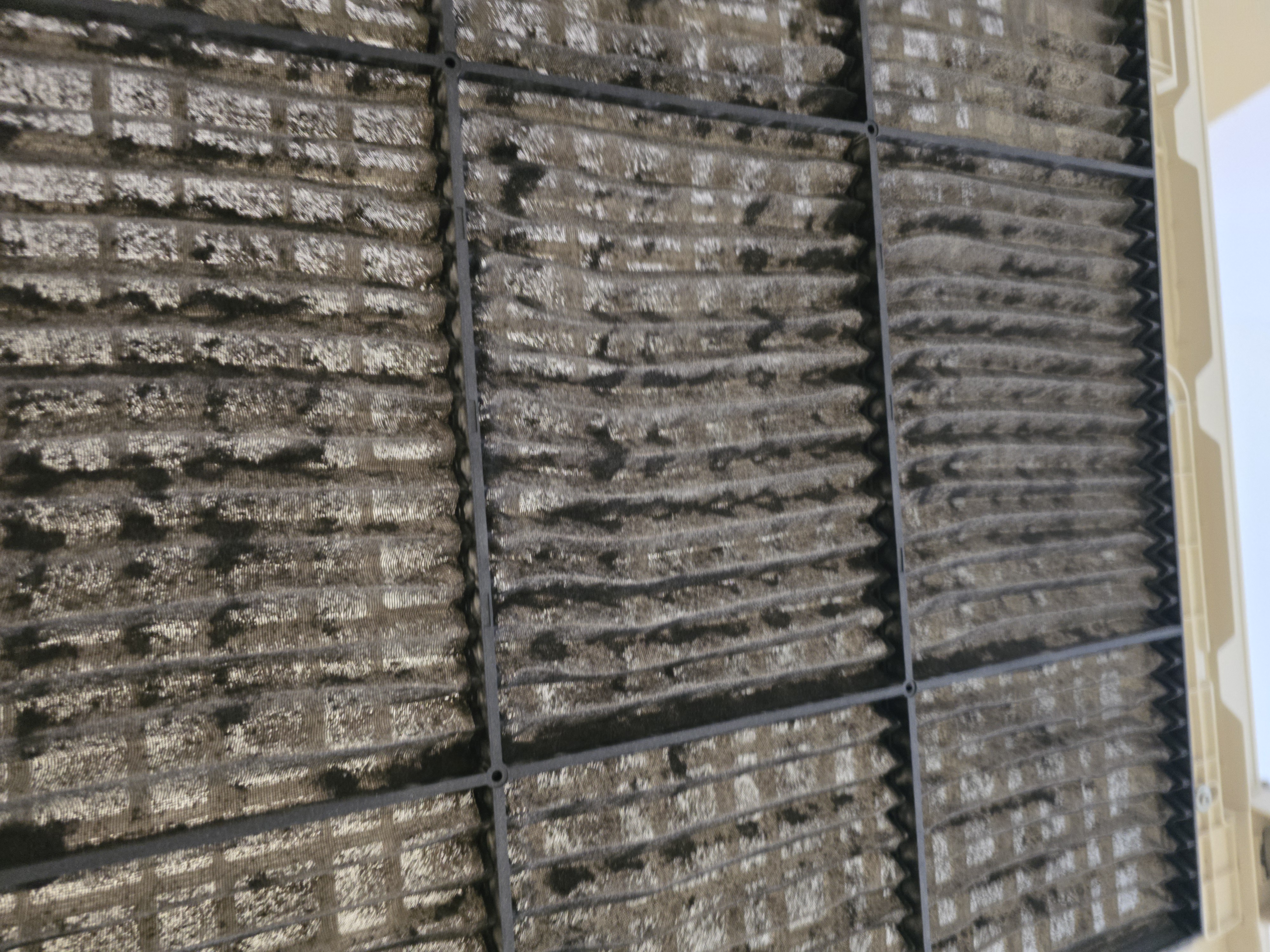 작동을 먼저 확인한 뒤 커버를 열었습니다. 필터는 이미 막혀 있었고, 인테리어 분진과 곰팡이가 쌓여있었습니다.